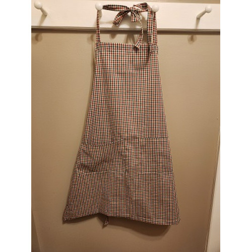 This kitchen apron has a woven checkered pattern with red, green and white. The apron is 100% cotton and a single layer to help keep you cool in the kitchen and it has two pockets to help you keep track of important things while cooking.